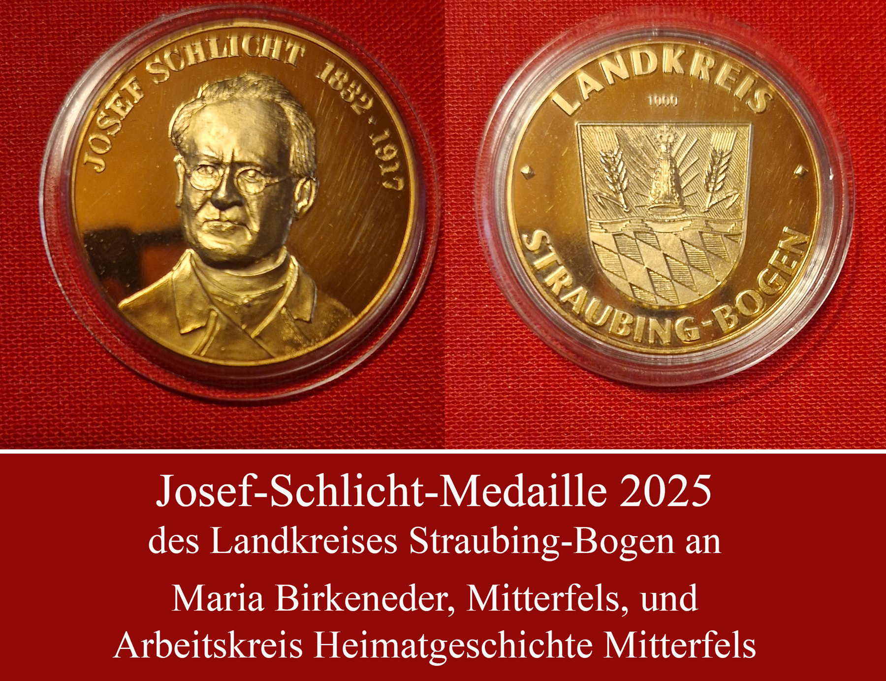 Mit der Josef-Schlicht-Medaille 2025 ausgezeichnet wurden Maria Birkeneder sowie der Arbeitskreis Heimatgeschichte Mitterfels als zweiter Verein (nach „Eiskeller Haindling“ 2018). In beiden Fällen sei die Entscheidung einstimmig in der Kreistagssitzung am 11. August getroffen worden.