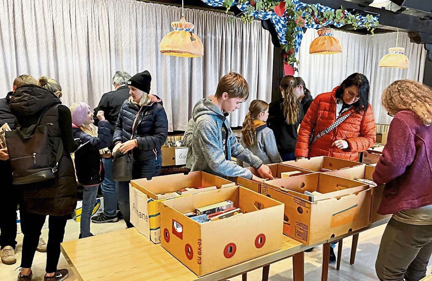 Der Flohmarkt des „Förderkreis Bücherei“ hat im Fischer-Saal einen passenden trockenen Standplatz gefunden.