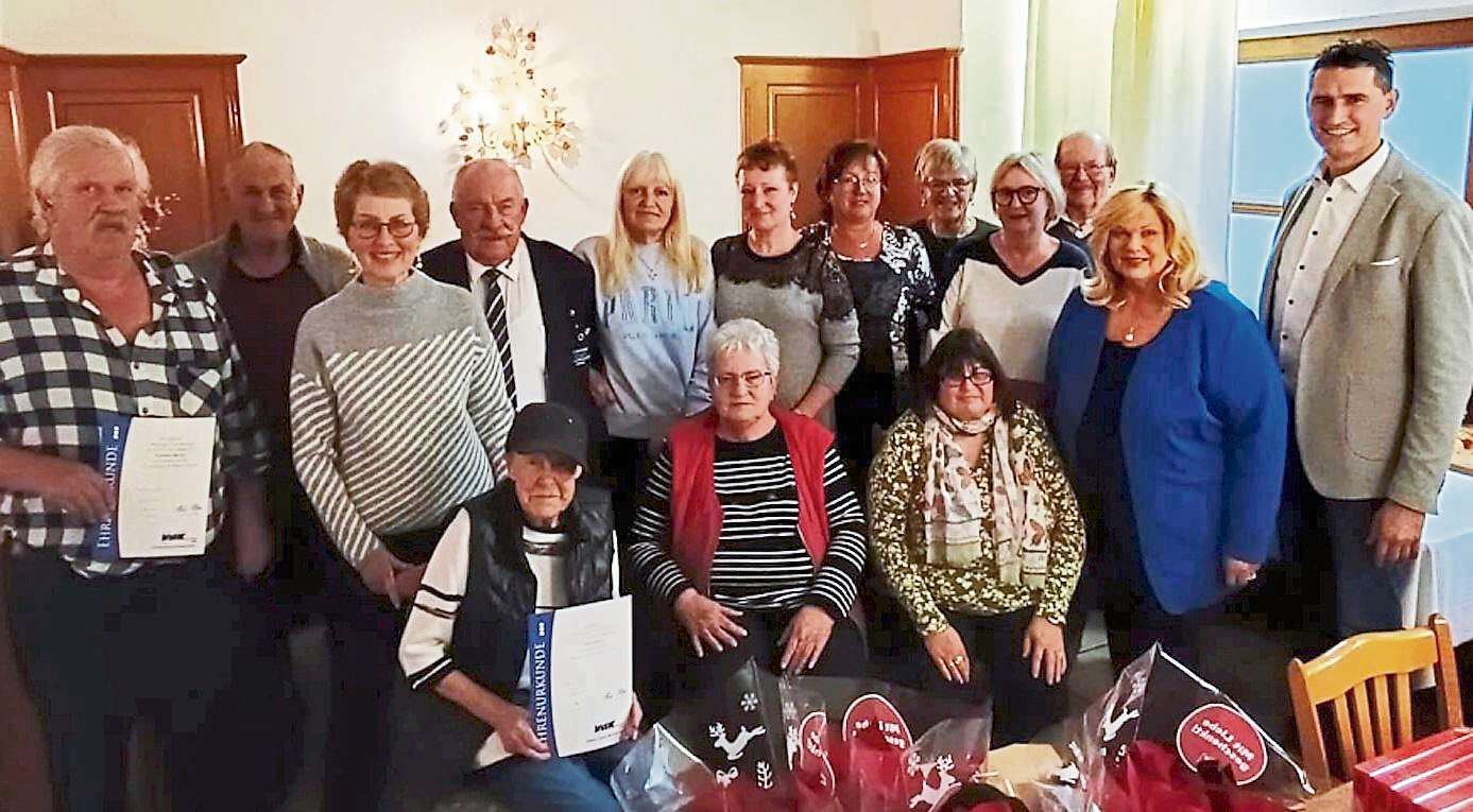 Die für 25 Jahre treue Mitgliedschaft Geehrten, die neue Vorstandschaft und die Ehrengäste: Johann Bachl, Wolfgang Paulus, Angelika Selmer, Heinz Pfleger, Otti Dietl, Roswitha Plobner, Monika Harguth, Jitka Harguth, Elisabeth Verflassen, Gisela Sörgl, Alexandra Stegbauer, Ewa Rozek, Franz Frankl, Barbara Ebenbeck-Petzi, Bürgermeister Andreas Liebl (v. l.) - Foto: Günther Gruber