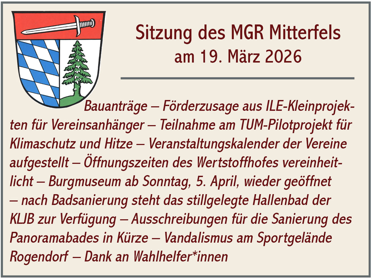 Unter Informationen wurde mitgeteilt, dass das Burgmuseum ab Sonntag, 5. April, wieder geöffnet hat. Es werden für die Öffnungstage für den Museumsdienst Ehrenamtliche gesucht. Bei Interesse kann man sich an das Burgmuseum oder an die Marktgemeinde Mitterfels wenden. Während der Schließung des Panoramabades wurde die Wärmehalle durch die ortsansässige KLJB genutzt. Wegen der begonnenen Sanierungsarbeiten sei eine Nutzung aktuell nicht möglich, daher werde ein Ausweichquartier gesucht. Für die Zeit nach der Sanierung solle das stillgelegte Hallenbad der KLJB zur Verfügung gestellt werden.