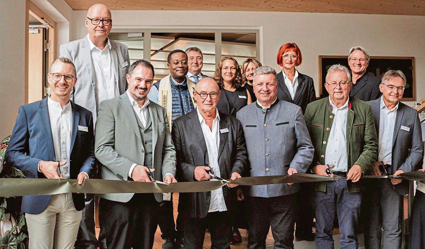 Durchschnitten feierlich das Band zur Einweihung: (v. l. vorne) die Geschäftsführer Matthias Bardas, Bastian Kulzer, Andreas Kulzer, Staatsminister Christian Bernreiter, Landrat Josef Laumer und Geschäftsführer Thomas Althammer sowie (v. l. hinten) Geschäftsführer Werner Hillmann, Pfarrer Dr. Ozioko, Bürgermeister Wolfgang Zirngibl und die Geschäftsführerinnen Stefanie Oberberger und Cathrin Petrick mit Ehrengästen. Foto: MKS Architekten-Ingenieure – Vergrößern durch Anklicken!