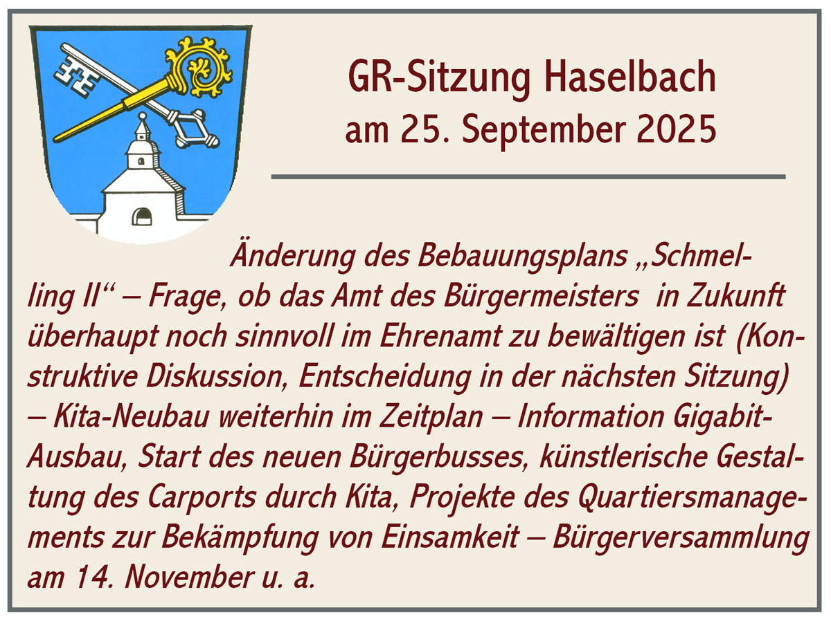 Zwei Themen haben die Sitzung des Gemeinderates Haselbach am Donnerstag besonders geprägt: die Änderung des Bebauungsplans „Schmelling II“ und die Diskussion über die künftige Rechtsstellung des Bürgermeisters. Daneben standen zahlreiche weitere Punkte auf der Tagesordnung, von Bauanträgen über den Neubau der Kindertagesstätte bis hin zum Umgang mit Einsamkeit im Alter.