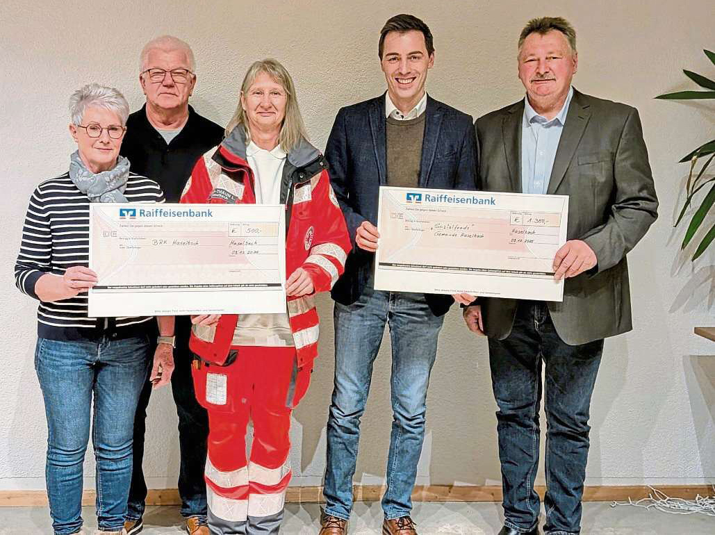 … haben die Familien Gospodarek und Steger am Dienstag an zwei Haselbacher Einrichtungen übergeben. 1.350 Euro gingen an den Sozialfonds der Gemeinde, der Menschen in akuten Notlagen sowie benachteiligte Gruppen bei der gesellschaftlichen Teilhabe unterstützt. Weitere 500 Euro erhielt die BRK-Bereitschaft Haselbach. Die Spendengelder stammen aus der Waldweihnacht, die im November im Pfarrholz stattfand. In stimmungsvoller Atmosphäre und bei winterlichen Temperaturen sorgten Musiker aus dem Ort für vorweihnachtliche Stimmung. Durch den Verkauf von selbst gemachten Plätzchen und Waffeln, Würstelsemmeln sowie Glühwein und Punsch konnte dank vieler ehrenamtlicher Helfer ein beachtlicher Erlös erzielt werden. Entgegengenommen wurden die Spenden von BRK-Bereitschaftsleiterin Liane Ecker-Thaun sowie Bürgermeister Simon Haas. Horst Gospodarek hob bei der Spendenübergabe die große Bedeutung des ehrenamtlichen Engagements hervor und dankte allen ehrenamtlichen Helfern und privaten Spendern, darunter auch Bürgermeister Simon Haas. – Bild: