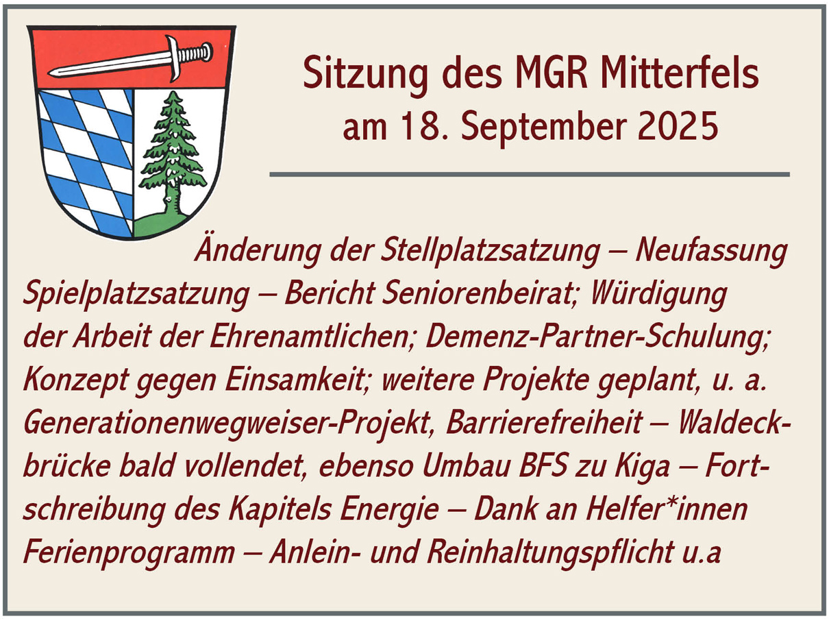 Da es zu Beschwerden kam, wurde erneut auf die Anleinpflicht für Hunde sowie die Reinhaltungspflicht in der Marktgemeinde hingewiesen. – Am Sonntag, 12. Oktober, ist Mitterfelser Marktmeile, am Samstag, 25. Oktober, gastiert das Polizeiorchester in Mitterfels.