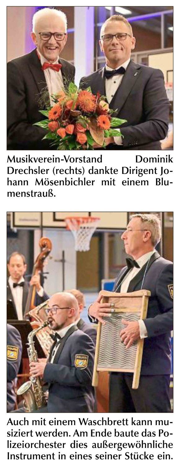 Unter Standing Ovations und mit tosendem Applaus wurde die musikalische Leistung des Orchesters gewürdigt. Unter den vielen Besuchern waren auch zahlreiche Ehrengäste aus Polizei und Politik, wie der niederbayerische Polizeipräsident Roland Kerscher, Vize-Präsident Werner Sika, der stellvertretende Leiter der Kriminalpolizeiinspektion Straubing, Christian Rottbauer, Landrat Josef Laumer und die Landtagsabgeordneten Josef Zellmeier und Tobias Beck. Als Dank überreichte Musikverein-Vorstand Dominik Drechsler stellvertretend für das gesamte Orchester an Dirigent Johann Mösenbichler einen Blumenstrauß.