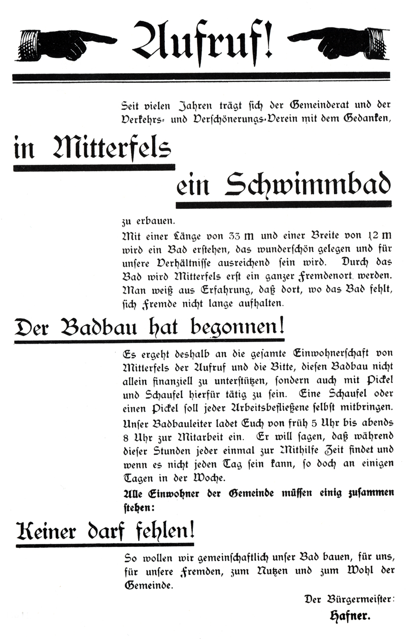 Da kam ihm der Gedanke, für Mitterfels auf gleiche Weise auch ein Schwimmbad zu erstellen. Als schönster Platz bot sich die Freifläche neben dem Steinbruch an, wo man ein Jahr zuvor das Material für die neue Steinburger Straße gewonnen hatte.