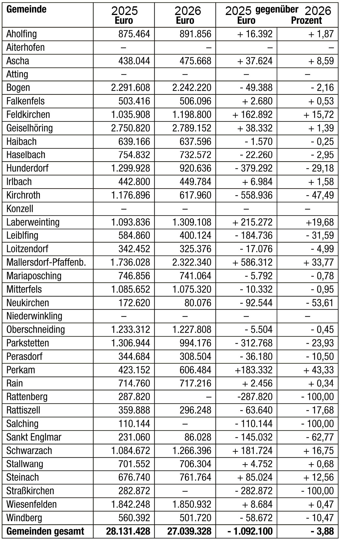 Diese Gemeinden gehen leer aus: Wie auch schon in den Vorjahren gehen die traditionell gewerbesteuerstarken Landkreisgemeinden Aiterhofen, Atting, Niederwinkling und Konzell leer aus. Hinzu kommen in diesem Jahr noch die Gemeinden Salching und Straßkirchen. Auch die Gemeinde Rattenberg geht leer aus. Sehr zur Überraschung von Bürgermeister Dieter Schröfl: Zwar habe er damit gerechnet, dass die Zuweisungen nicht mehr so üppig ausfallen werden, schließlich habe Rattenberg in jüngerer Vergangenheit gute Steuereinnahmen gehabt, „aber dass sie uns komplett gestrichen wird, überrascht mich dann doch“. Dabei richtet er den Blick auf aktuelle Ausgaben. Da ist zum einen das Kita-Gebäude, zum anderen koste die Abwasserversorgung die Gemeinde eine siebenstellige Summe. Daneben laufen noch weitere Projekte wie Straßen- und Gebäudesanierungen – und auch die Rathaussanierung koste. „Das tut natürlich weh. Gerade in den aktuellen Zeiten, wo man als Kommune jeden Euro gut brauchen könnte.“