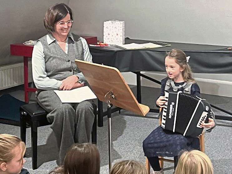 Schon der Kinderchor sorgte für eine warme Atmosphäre. Am Klavier begeisterten unter anderem Antonia Höglmeier, Lotte Diermeier, Emily Sperl, Paul Albersinger, Clara Brandner, Lena Wirth, Kirill Ott, Julia Brockerhoff und Jonathan Thomas, die ihre Stücke mit viel Konzentration und Mut vortrugen. Jonas Zwickenpflug brachte mit dem Keyboard Schwung ins Programm, Vreni Berglehner ließ ihre Harfe sanft erklingen und Helena Dachauer sorgte mit dem Akkordeon und Gesang für weihnachtliche Klangvariationen. Einen ruhigen Moment schenkte Artem Ott dem Publikum mit dem gefühlvollen Stück „Una Mattina“. Das anspruchsvolle Werk, bekannt aus dem Film „Ziemlich beste Freunde“, trug er gekonnt und eindrucksvoll am Flügel vor. Elena Bodenheimer, eine junge erwachsene Klavierschülerin, bereicherte mit einem mutig vorgetragenen Menuett von Bach. Zwischen fröhlichen und leisen Tönen wurde immer wieder deutlich, wie viel Freude die Kinder am Musizieren haben. Stolze Eltern, Großeltern und Freunde spendeten reichlich Applaus.