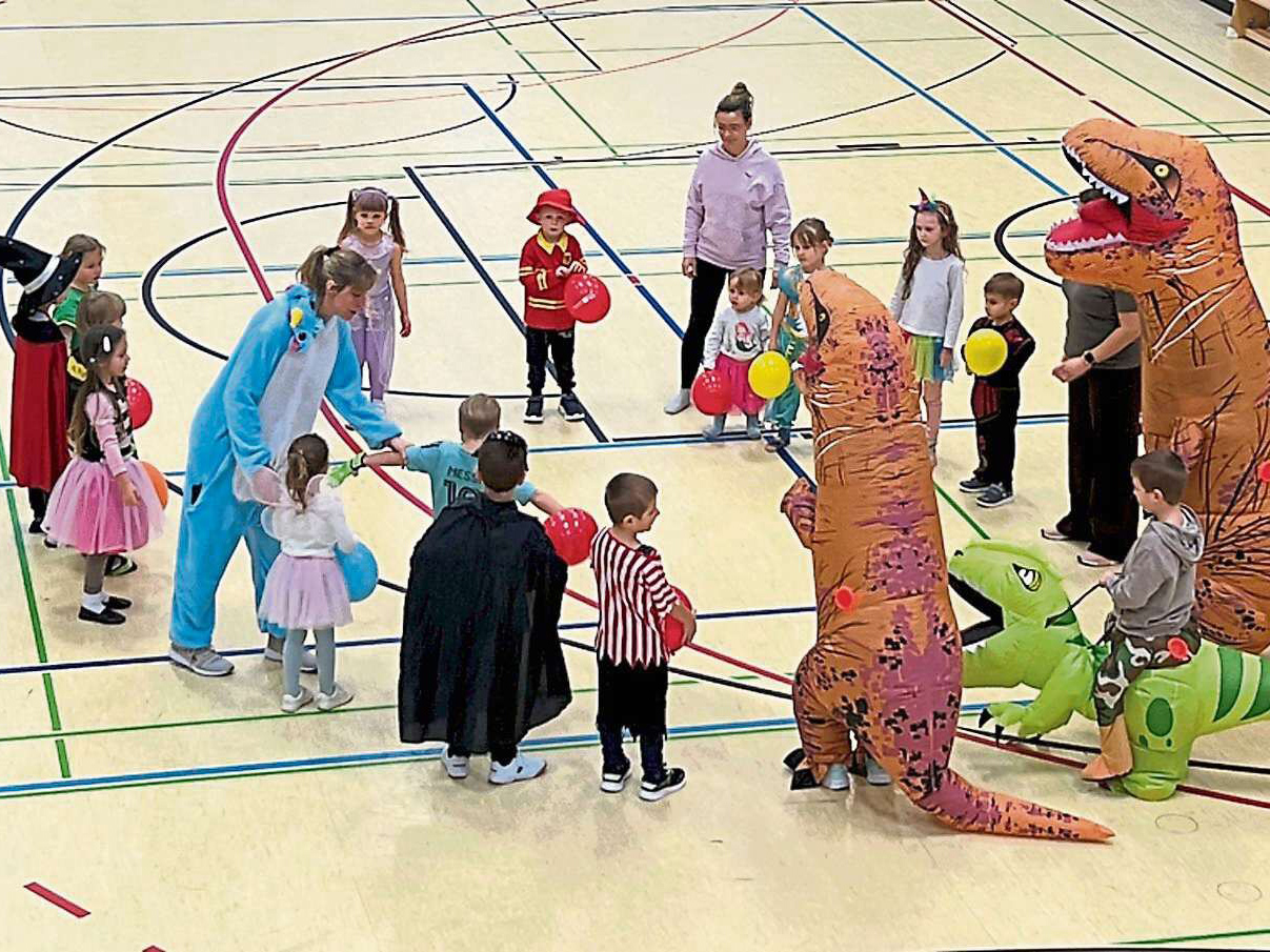 ... in der großen Turnhalle zu. Insgesamt rund 50 gut gelaunte, verkleidete Kinder vergnügten sich in den Eltern-Kind-Gruppen „Flitzmäuse 1 und 2“ und in der Vorschulgruppe „Flinke Hasen“ und sorgten für Stimmung.