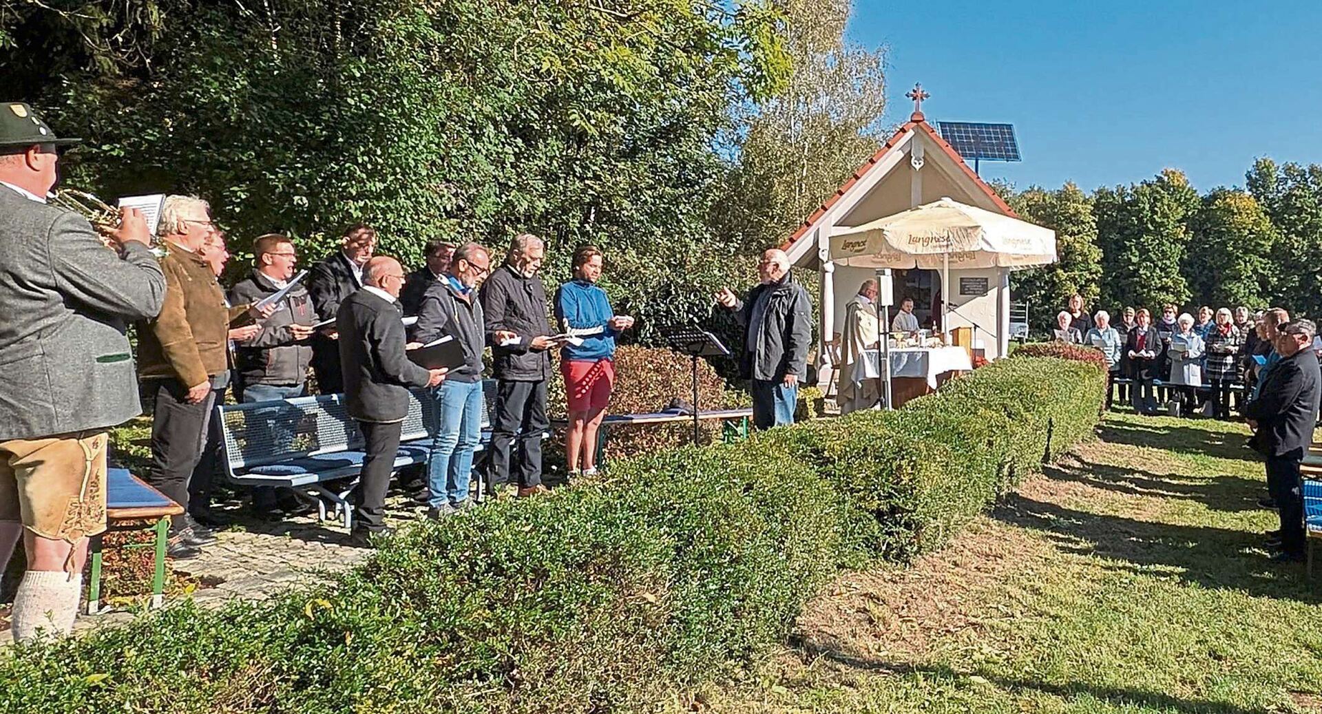 Umrahmt wurde der Gedenkgottesdienst, wie es Tradition ist, durch den Steinacher Liturgiechor unter Leitung von Judith Wagner, zur Feier des Tages unterstützt vom Männergesang der geplanten Kantorei des Kulturfördervereins Joseph Schlicht unter Karl Penzkofer und der Blaskapelle „d’Amann’s“ aus Pfelling. Wie zu Ehren der Schöpfung klang so über die Köpfe der Gottesdienstbesucher die Deutsche Messe von Franz Schubert über die sonnenüberfluteten Wiesen an der Gedenkkapelle wie auch das Franziskuslied.