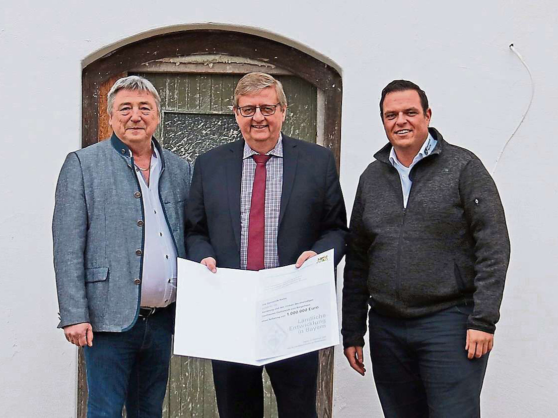 Übergabe der Auszahlungsurkunde vor dem Eingang zum einstigen Gasthaus „Reiwa Heigl“ in Gschwendt (von links): Aschas Bürgermeister Wolfgang Zirngibl, ALE-Leiter Hans-Peter Schmucker und 2. Bürgermeister David Groth - Foto: Karin Stelzl/ALE Niederbayern