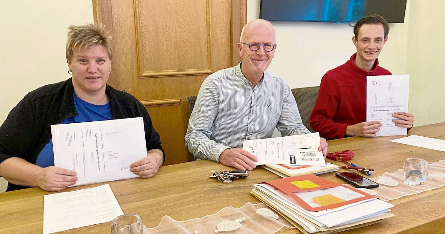 Ken-Roy Hummel (r.) und Verena Klein (l.) durften gemeinsam mit Berthold Mühlbauer, dem Geschäftsführer der Marktgemeinde Mitterfels, die Unterlagen für eine Ausschreibung öffnen.