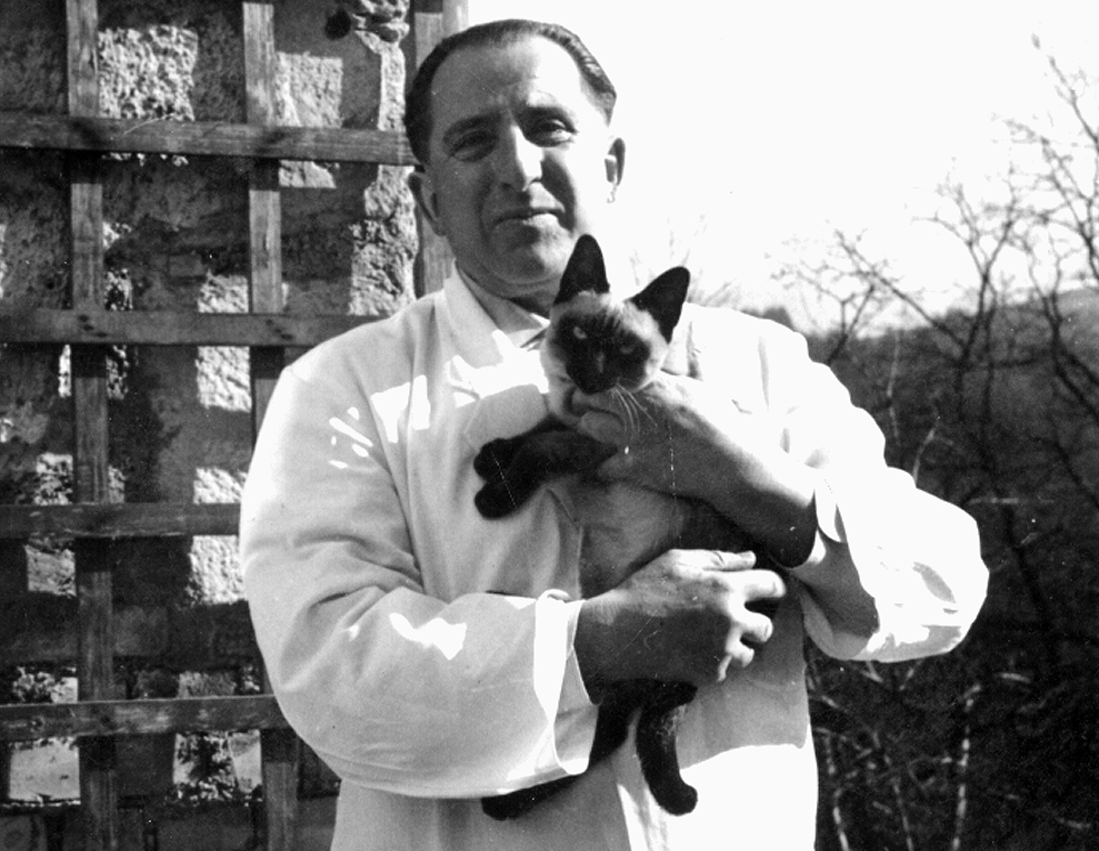 Dr. Müller mit seiner Lieblingskatze, die er zuweilen bei Regen im Garten mit dem Schirm bei ihren „Geschäften” begleitete.