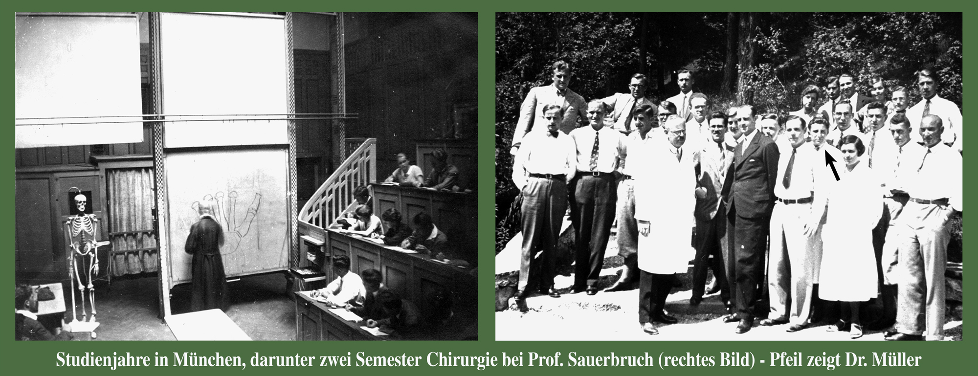 Dr. Müller begann in einer schwierigen Zeit als „Landarzt”. Weit und breit war er der einzige Arzt. So musste er oft weite Strecken mit der Kutsche oder zu Fuß zurücklegen, um bei Geburten oder Notfällen, bei Unfällen auf der Straße oder in bäuerlichen Betrieben helfen zu können. Erst nach dem Krieg stand ihm ein Fahrzeug zur Verfügung.