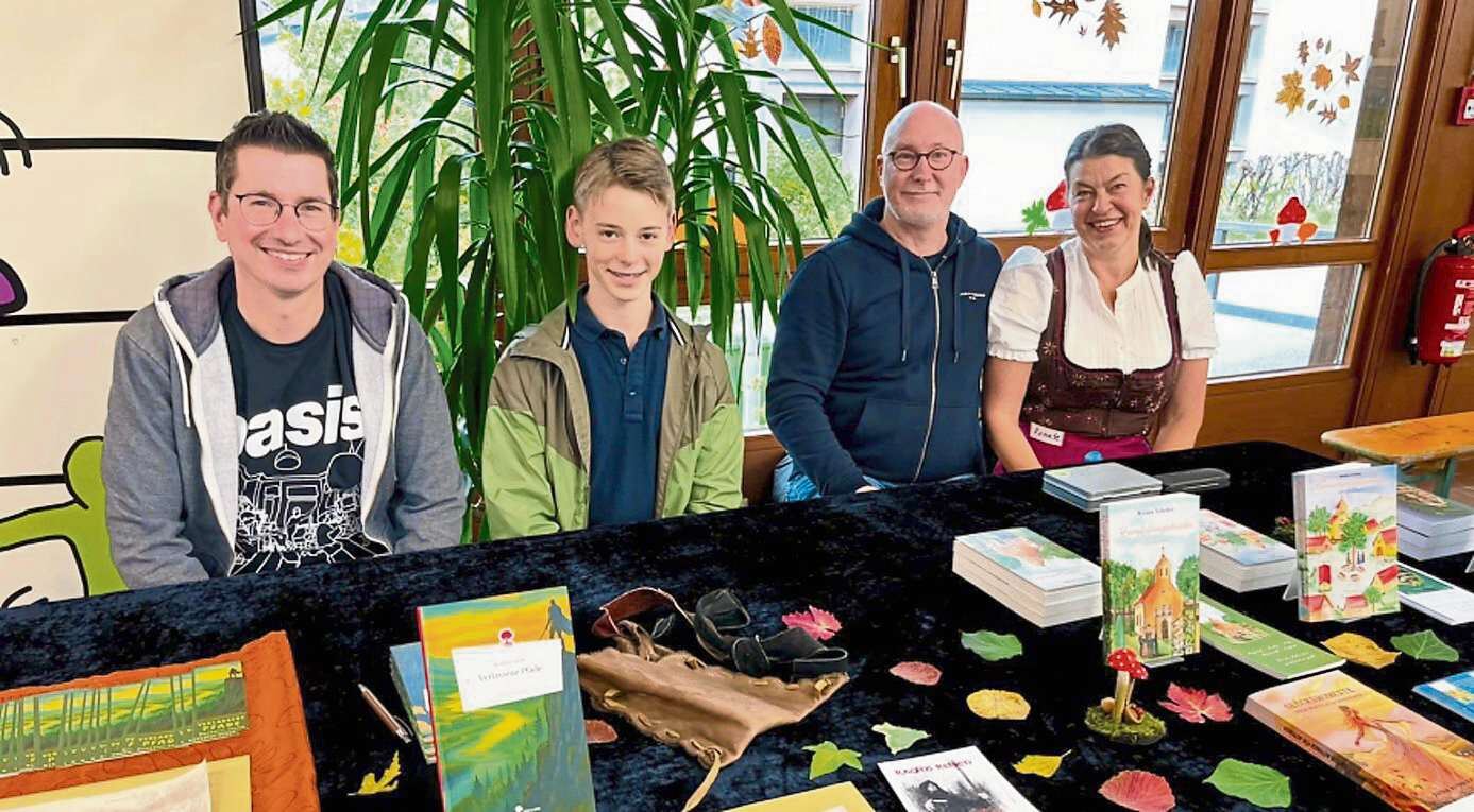 Die Jungautoren (v. l.) Florian Bock und Benedict Jacob stellten ihre Bücher vor, hier zusammen mit Torsten Mehlhase und Initiatorin Renate Schober.