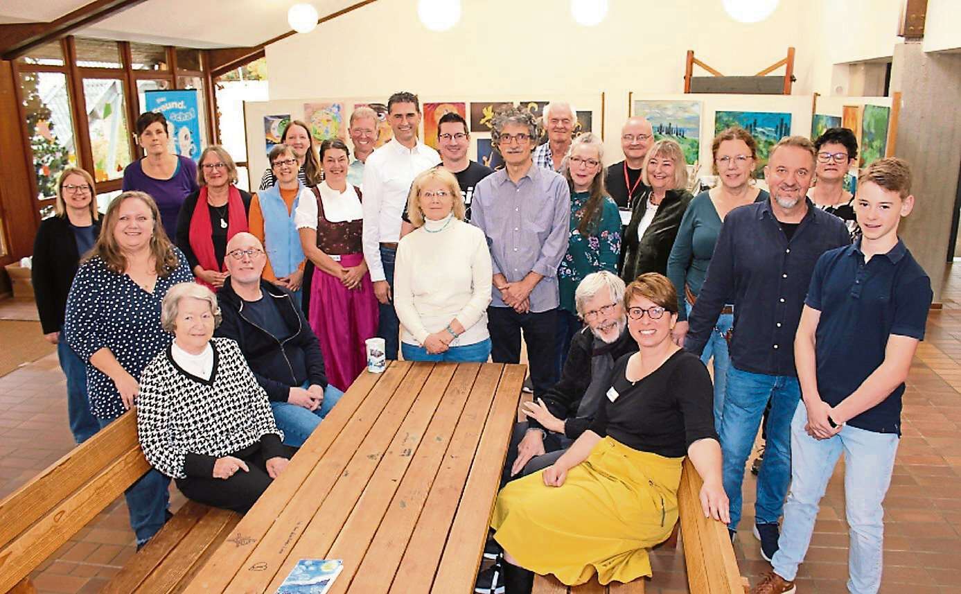 Die Aussteller der ersten „Buch & Bild“-Messe, hier mit Bürgermeister Andreas Lieb (elfter von links, stehend), präsentierten ihre Werke in der Schule in Mitterfels. Fotos: Barbara Jacob
