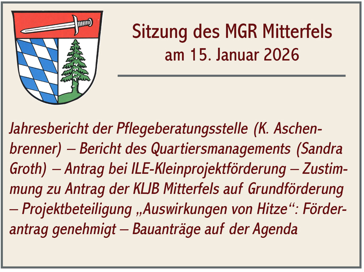 Externer Referent zum Thema Pflege war K. Aschenbrenner. Er sprach von einer guten Zusammenarbeit mit der Marktgemeinde wie auch mit dem Quartiersmanagement Mitterfels/Haselbach. Das Angebot der Pflegeberatung wurde auch 2025 sehr gut angenommen, es gab insgesamt 475 Beratungskontakte, die sich in Telefonberatung, Vortragsveranstaltungen sowie Hausbesuche aufgliederten. Aschenbrenner teilte mit, dass alle durch ihn erstellten pflegefachlichen, gutachterlichen Expertisen, die zur Abgabe für die Begutachtung durch den MDK Bayern beziehungsweise die Pflegekasse oder einen Widerspruch vorlagen, genehmigt worden seien.