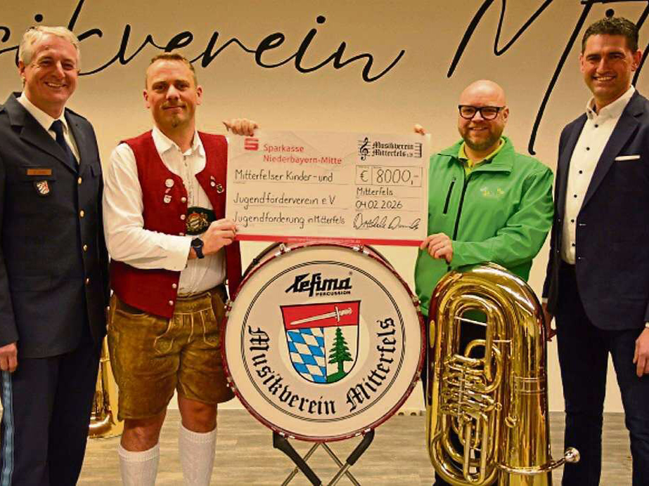 Mit großer Freude übergab der Vorsitzende des Musikvereins Mitterfels, Dominik Drechsler, den Spendenscheck an Dominic Rauscher, Vorstand des Mitterfelser Kinder- und Jugendfördervereins. Bei der Übergabe anwesend waren zudem Bürgermeister Andreas Liebl sowie Josef Eckl, Dienststellenleiter der Polizeiinspektion Straubing, der stellvertretend für das Polizeiorchester Bayern teilnahm. Der Musikverein zeigt sich stolz, mit dem Jubiläumskonzert nicht nur ein kulturelles Highlight gesetzt, sondern zugleich einen wertvollen Beitrag zur Förderung der Jugend geleistet zu haben. Der Kinder- und Jugendförderverein wird die Spendensumme nun gezielt einsetzen, um Jugendprojekte der örtlichen Vereine zu unterstützen und damit das gemeinschaftliche Engagement im Ort weiter zu stärken.