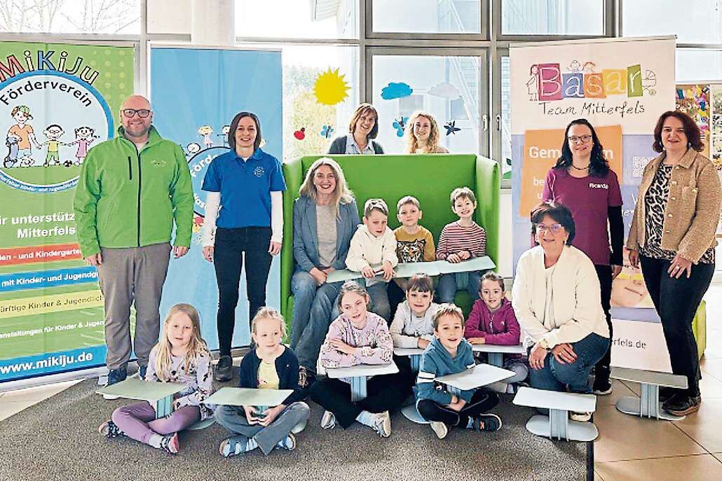 Die Vorstandsmitglieder von MiKiJu (Dominik Rauscher, l.), Förderkreis Kinder Haselbach (Kathi Fischl, 2. v. l.) und Basarteam (Ricarda Knott, 2. v. r.) übergaben die Sitztische an das Kollegium der Grundschule, darunter Rektorin Marion Brandl (sitzend, 3. v. l.) sowie die Lehrkräfte der 1. und 2. Klassen Claudia Bach-Jobst (hinten, l.), Lisa Fischer (hinten, r.), Tatjana Steininger-Nelz (r.) und Birgit Fuchshuber (kniend). - Foto: D. Rauscher